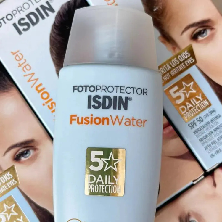 ضدآفتاب ایزدین مدل فیوژن واتر ISDIN FUSION WATER ساخته شده بر پایه آب جذب سریع به علت برخورداری از فیوژن دارای درصد مناسبی از فاکتورهای ضد آفتاب با SPF50 حاوی ویتامین E فرمولاسیون قابل بازیافت فاقد پارابن، الکل و چربی (oil free) دارای خواص آبرسانی و مرطوب کنندگی به دلیل داشتن اسید هیالورونیک مناسب برای پوست های چرب و نرمال مقاوم در برابر تعریق ساخت اسپانیا بی رنگ و بافت سبک