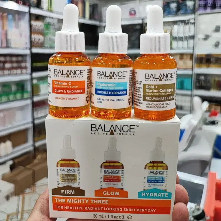 پک 3عددی سرم پوستی بالانس مدل The mighty three Balance active formula the mighty 3 serum set سرم جوانساز کلاژن جوانسازی پوست آبرسانی بالا پوست حفظ رطوبت سطح پوست حاوی کلاژن و آنتی اکسیدان سرم روشن کننده حاوی ویتامین سی رفع لکه ها مناسب انواع پوست سرم هیالورونیک اسید غیر چرب مرطوب نگه داشتن پوست کاهش علائم پپری ساخت کشور انگلستان حجم هر عدد 30 میل مجموع پک 3عددی 90 میل