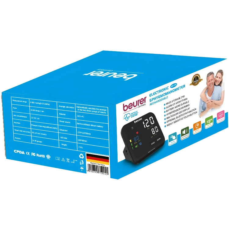 صفحه نمایش سیاه رنگ XL با خوانایی آسان • دارای فن آوری باد شدن • اندازه گیری تمام اتوماتیک فشار خون و نبض روی بازو • نشانگر خطر LED: طبقه بندی اندازه گیری ها با مقیاس LED رنگی • تشخیص آریتمی • دارای فضای حافظه که هر کدام 2*99 مقدار اندازه گیری شده را در خود ذخیره میکند • میانگین تمام مقادیر اندازه گیری شده در دسترس است • بررسی موقعیت دستگاه • ویژگی های فنی • وزن 19.9کیلوگرم • ابعاد 85× 110×135سانتیمتر • جنس بدنه پلاستيک • رنگ بدنه سیاه • نوع نمایشگر LED • منبع تغذیه شارژی •مدل 2023 •دارای سخنگوی فارسی • کاربرد پزشکی • سایز مناسب مچ\u002Fبازو 22~42سانتی متر طوی کل: 57 سانتی متر • استاندارد گواهی استاندارد اروپا CE