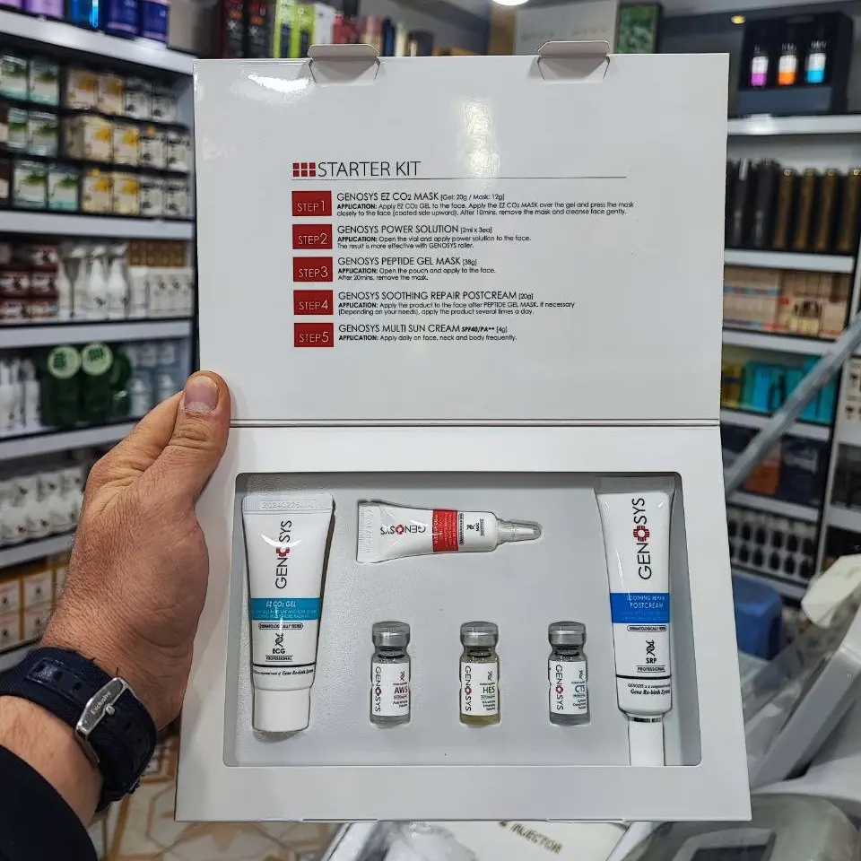 استارتر کیت ژنوسیس یک کیت کامل برای جلسات درمانی شامل: ژل کربوکسی CO2 ژنوسیس کرم ضد آفتاب ژنوسیس کرم ضد التهاب و ترمیم کننده ژنوسیس ماسک ژلی پپتاید ژنوسیس ماسک فعال ساز ژل کربوکسی ژنوسیس کوکتل CTS (ضد اسکار) کوکتل HES (آبرسان) کوکتل AWS (جوانساز و ضد چروک) کاردک فلزی ماسک این کیت برای افرادی که نیاز به جلسات فوری درمانی دارند و همچنین قصد تست کیفیت برند ژنوسیس کره را دارند کاملا مناسب است.